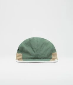 Butter Goods Cliff 4 Panel Cap in Army. Made from 100% nylon ripstop, this four panel Butter Goods cap is designed with a panelled profile and contrast stitching. Finished in a shade of army green with an adjustable hike-cord fastening, this Butter Goods cap also features a rubber brand patch graphic.