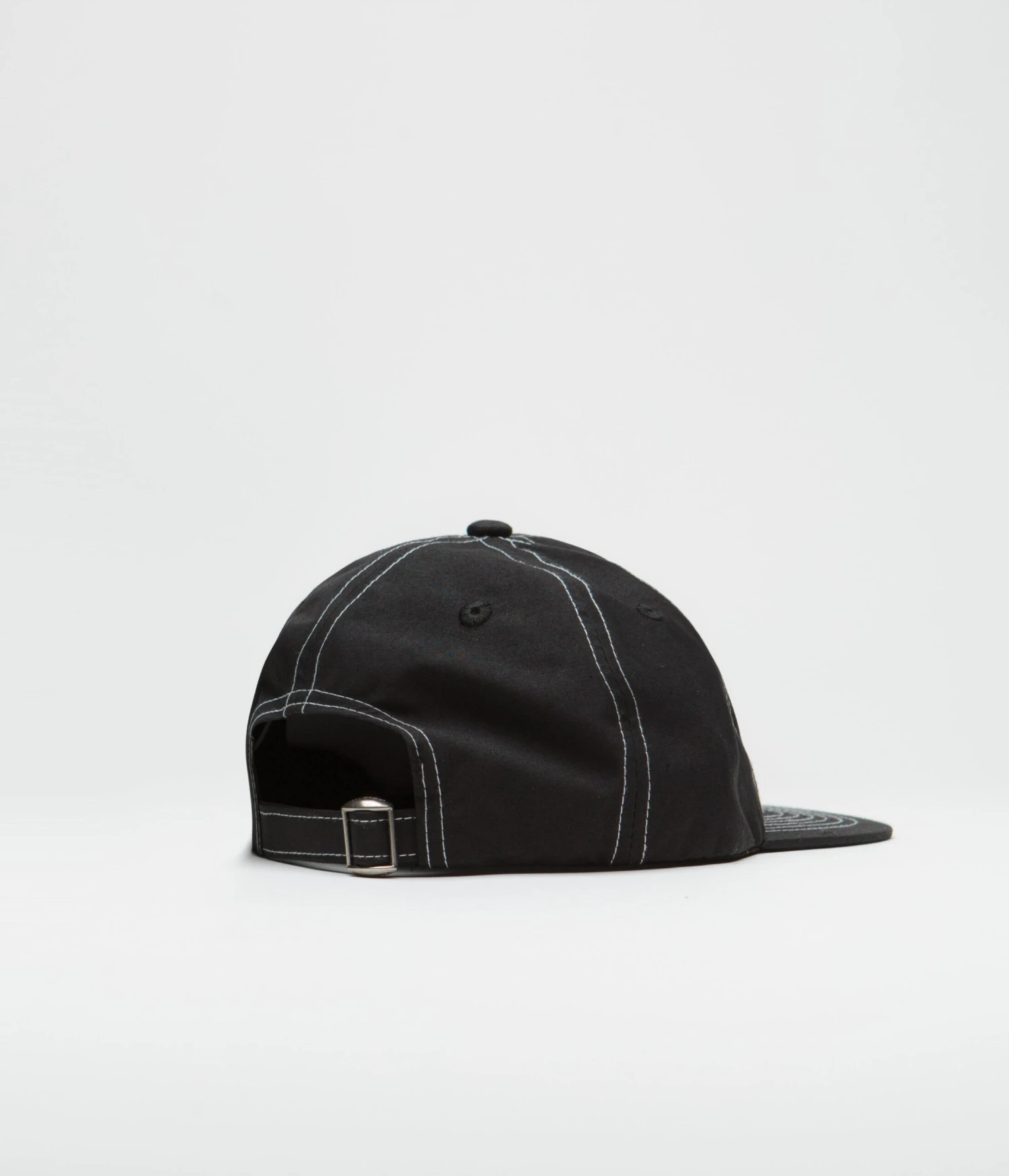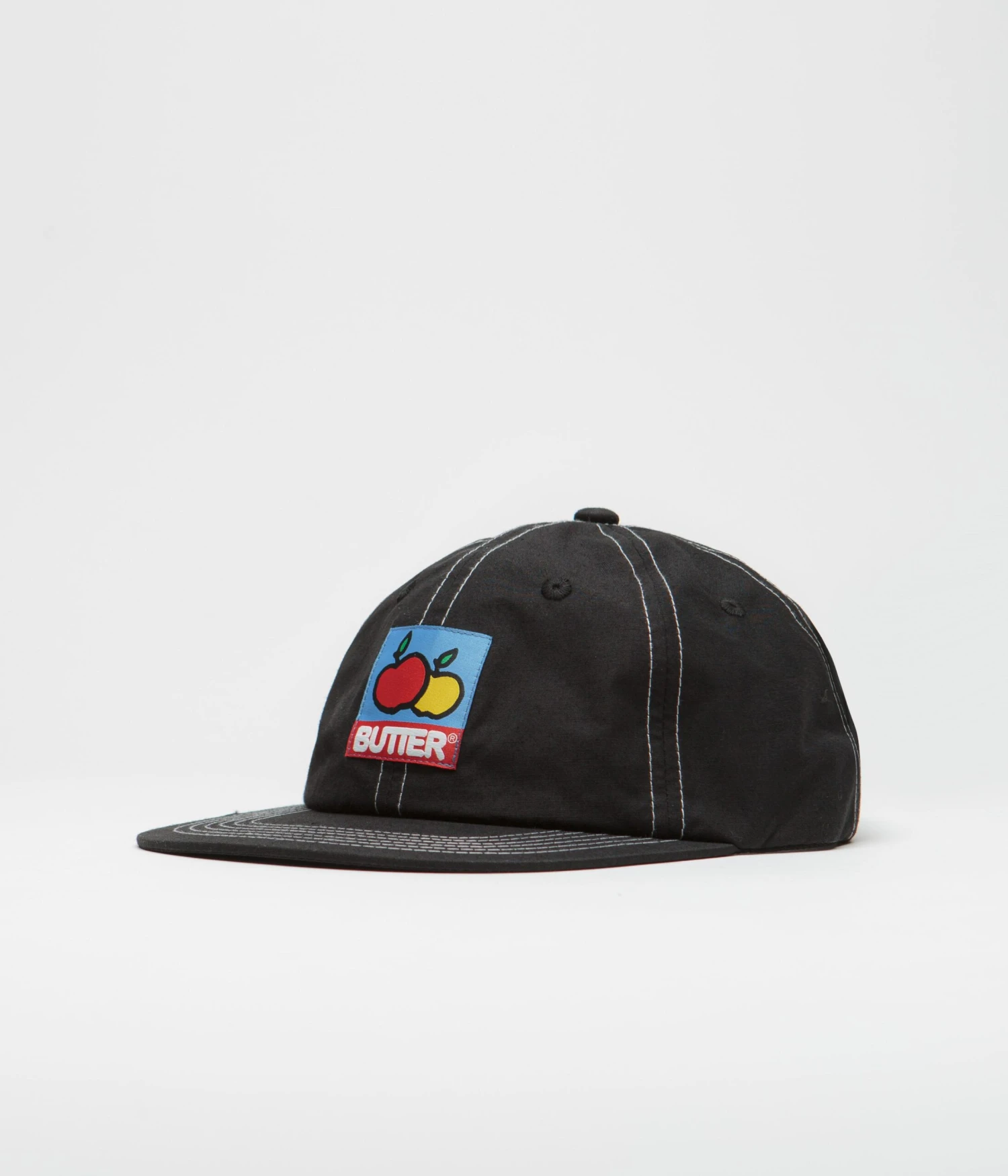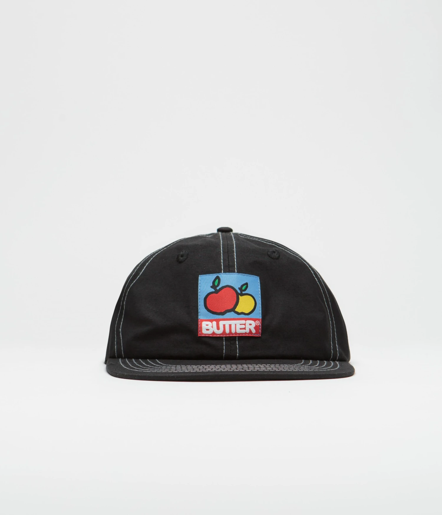 Butter Goods Grove Cap in Black. Single sized with a six panel profile, this Butter Goods cap is made from a cotton-nylon blend. Featuring contrast stitching, embroidered eyelets and an adjustable self-fabric fastening, this black Butter Goods cap is finished with an embroidered Butter crown graphic.