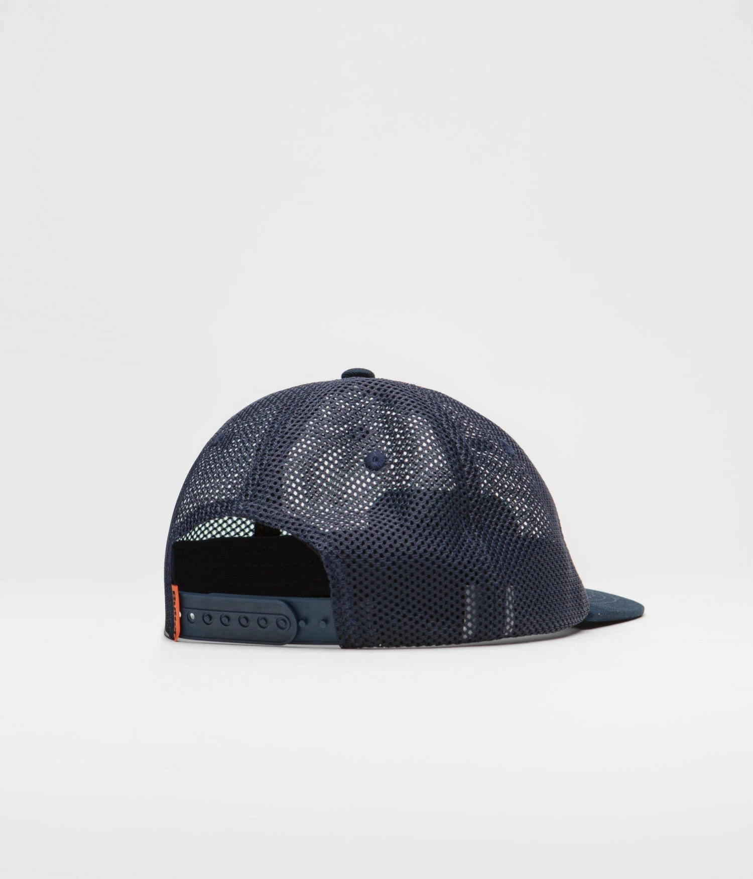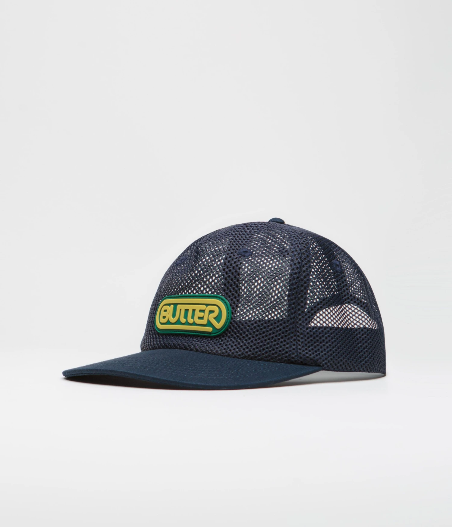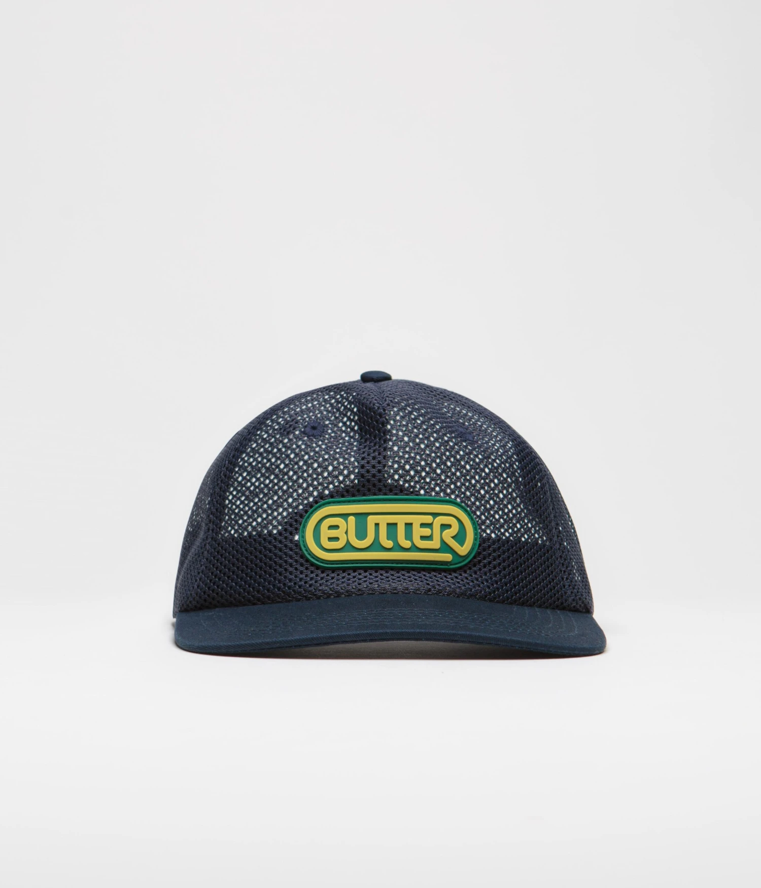 Butter Goods Mesh Shallow Cap in Indigo. Designed with a cotton twill visor, this six panel Butter Goods cap is made from 100% polyester mesh. Featuring embroidered airflow eyelets and an adjustable snapback fastening, this indigo Butter Goods cap is finished with a rubber Butter crown graphic.