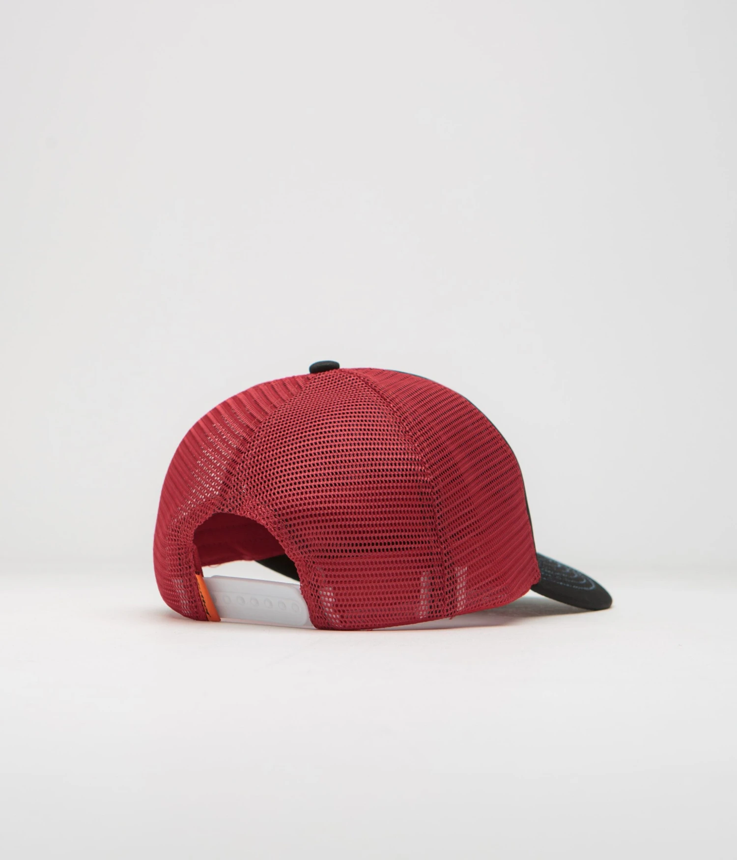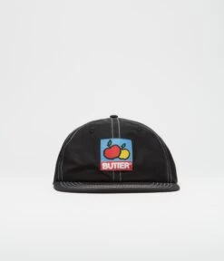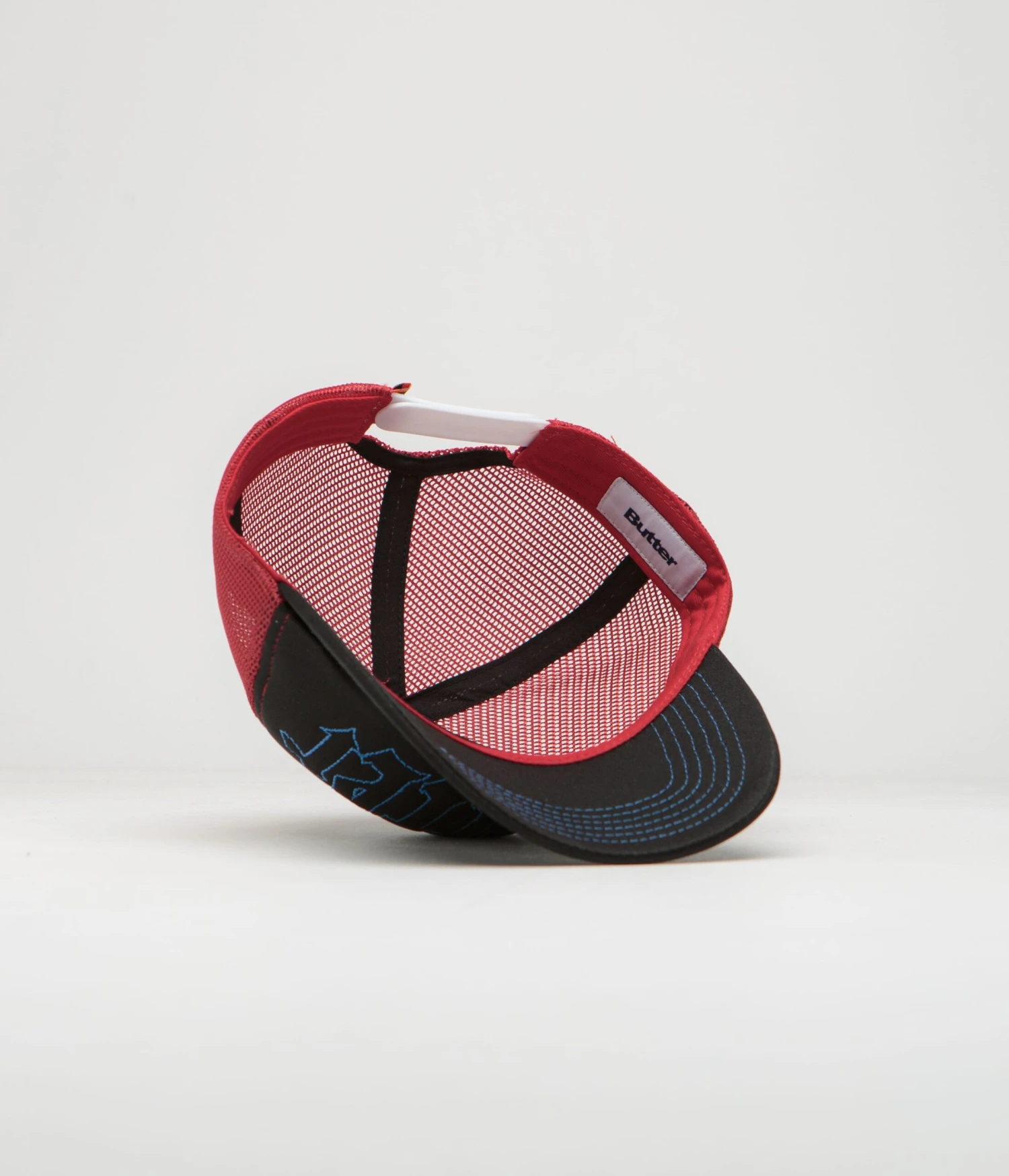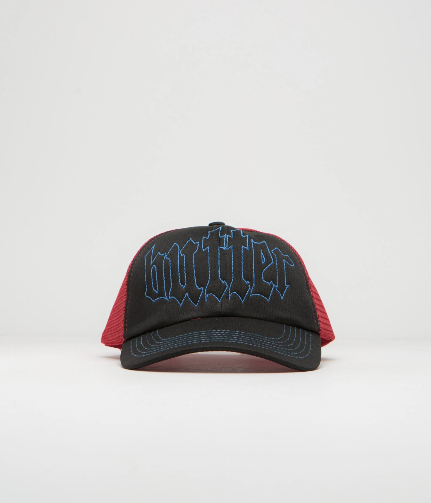 Butter Goods Shock Trucker Cap in Black. Single sized and made from 100% polyester, this Butter Goods cap is designed with foam backing and contrasting mesh panels. Featuring an adjustable snapback fastening and contrast stitching, this black Butter Goods cap is finished with embroidered crown branding.