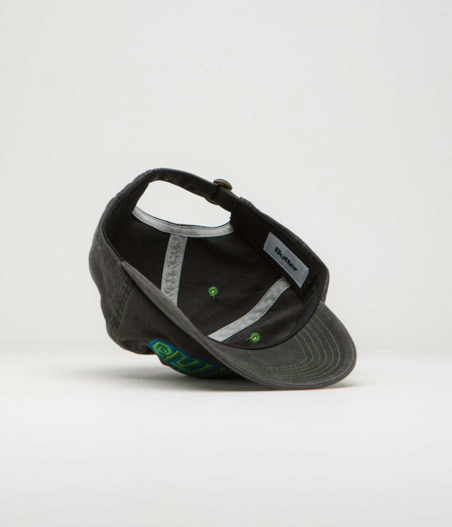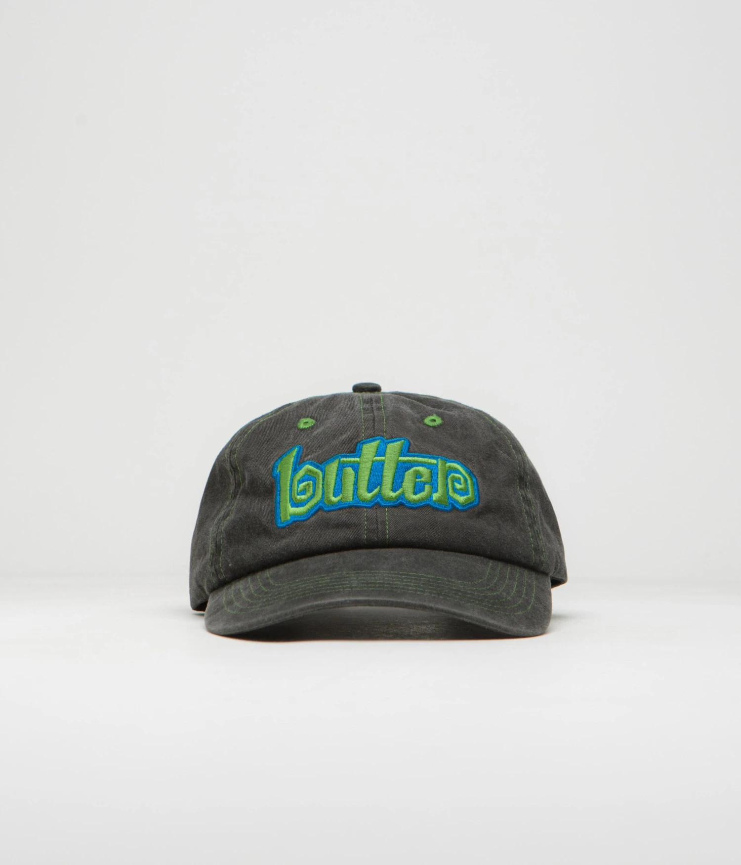 Butter Goods Swirl Cap in Washed Black. Styled with contrast stitching, this six panel Butter Goods cap is made from 100% cotton twill. Featuring a curved peak, embroidered airflow eyelets and an adjustable rear strap fastening, this black Butter Goods cap is finished with an embroidered crown graphic.